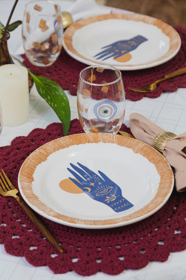 Este conjunto traz o poderoso símbolo da Hamsa, a mão mística que afasta más energias e atrai sorte e proteção para a sua mesa. Ideal para qualquer ocasião, esses pratos são perfeitos para jantares especiais ou para adicionar um toque de significado às suas refeições diárias.