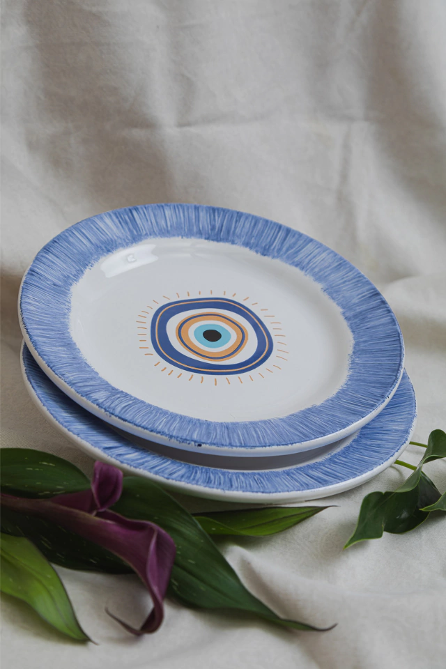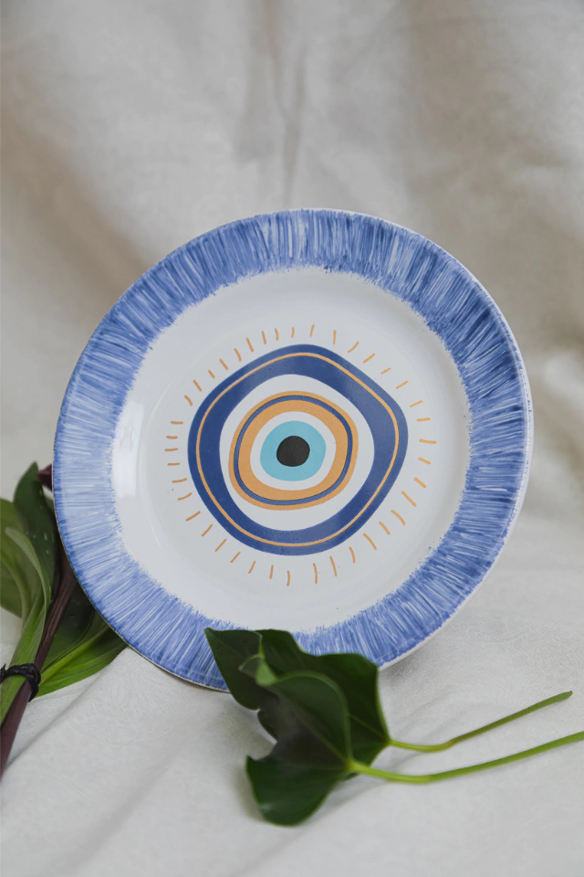 Este conjunto exclusivo traz dois pratos de jantar pintados à mão, cada um adornado com o icônico símbolo do Olho Grego, reconhecido por afastar energias negativas e atrair boas vibrações. Com design artesanal e estética moderna, ideal para quem valoriza decor alinhada à espiritualidade