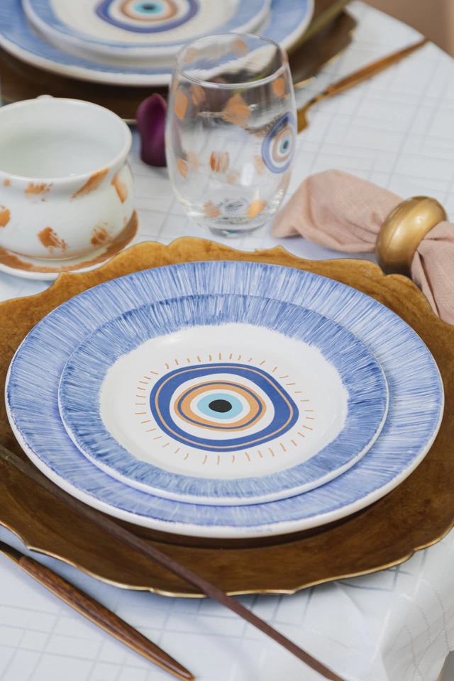 Amuleto de proteção: o Olho Grego é um poderoso símbolo esotérico que transmite segurança à mesa.