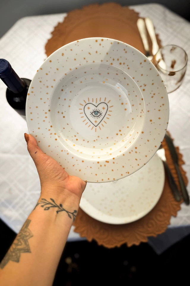 Os desenhos místicos aplicados manualmente trazem à sua mesa o poder do olhar e a intuição feminina, criando um ambiente acolhedor e cheio de energia. Ideal para servir sopas, massas ou caldos, esses pratos também servem como elementos decorativos que embelezam qualquer ocasião.