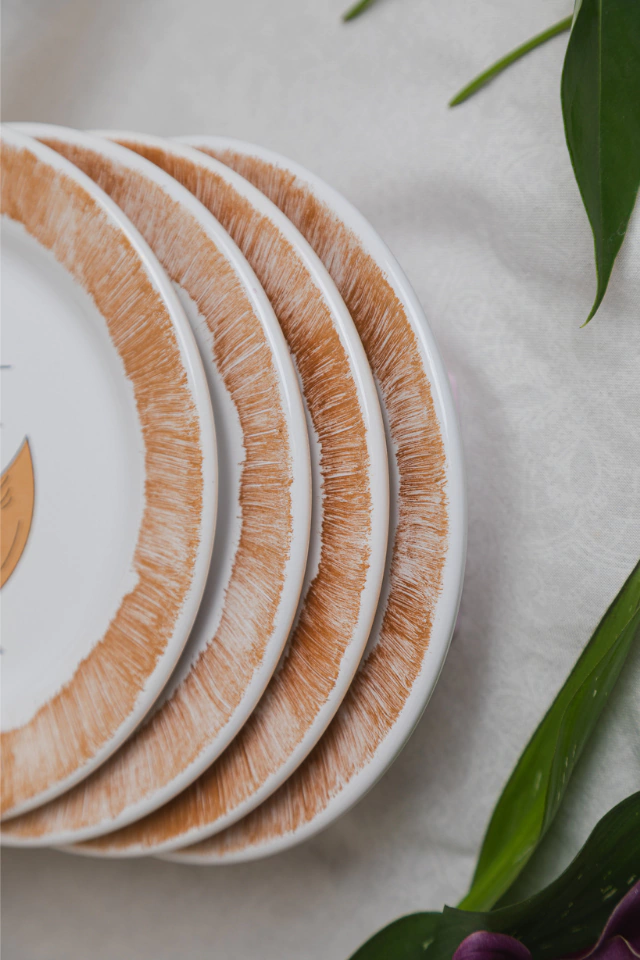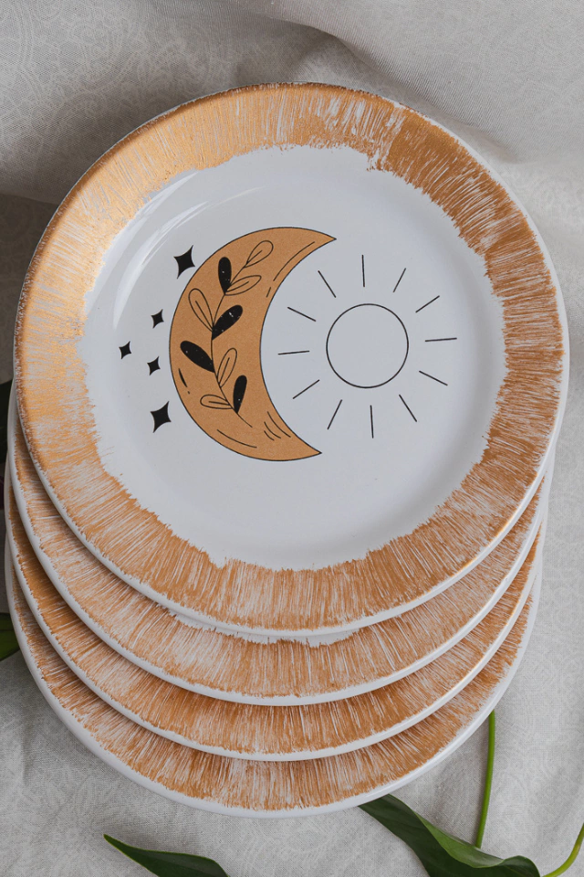 Este conjunto encantador faz parte da Coleção Talismã e combina quatro pratos de lanche pintados à mão, decorados com os símbolos do Sol (força, luz e vitalidade) e da Lua (intuição, calma e introspecção). Perfeito para quem busca uma mesa posta cheia de significado.