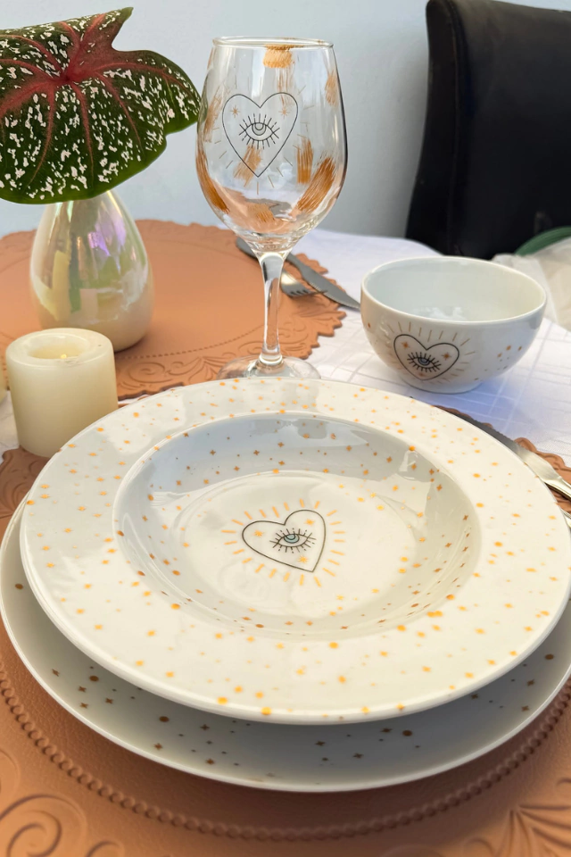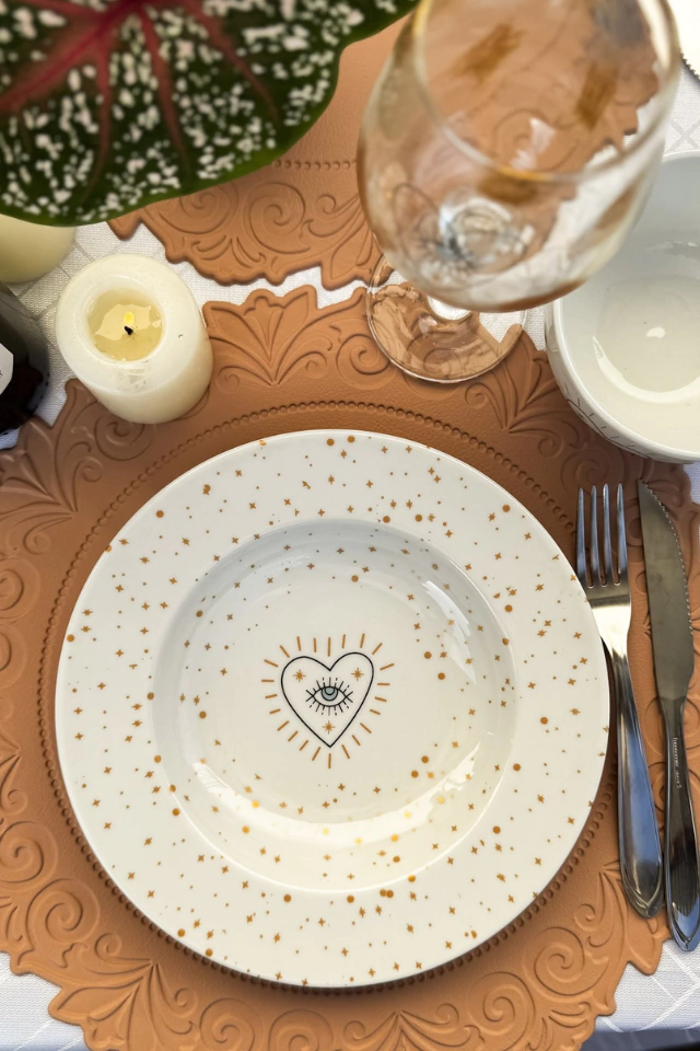 Os desenhos místicos aplicados manualmente trazem à sua mesa o poder do olhar e a intuição feminina, criando um ambiente acolhedor e cheio de energia. Ideal para servir sopas, massas ou caldos, esses pratos também servem como elementos decorativos que embelezam qualquer ocasião.